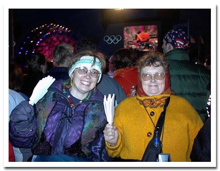 2002 Winter Olympics Salt Lake City, Utah Spectators Mother and daughter await the beginning of one of the metals ceremonies. This was held outdoors and we were very cold. Luckily we brought hand warmers and feet warmers.